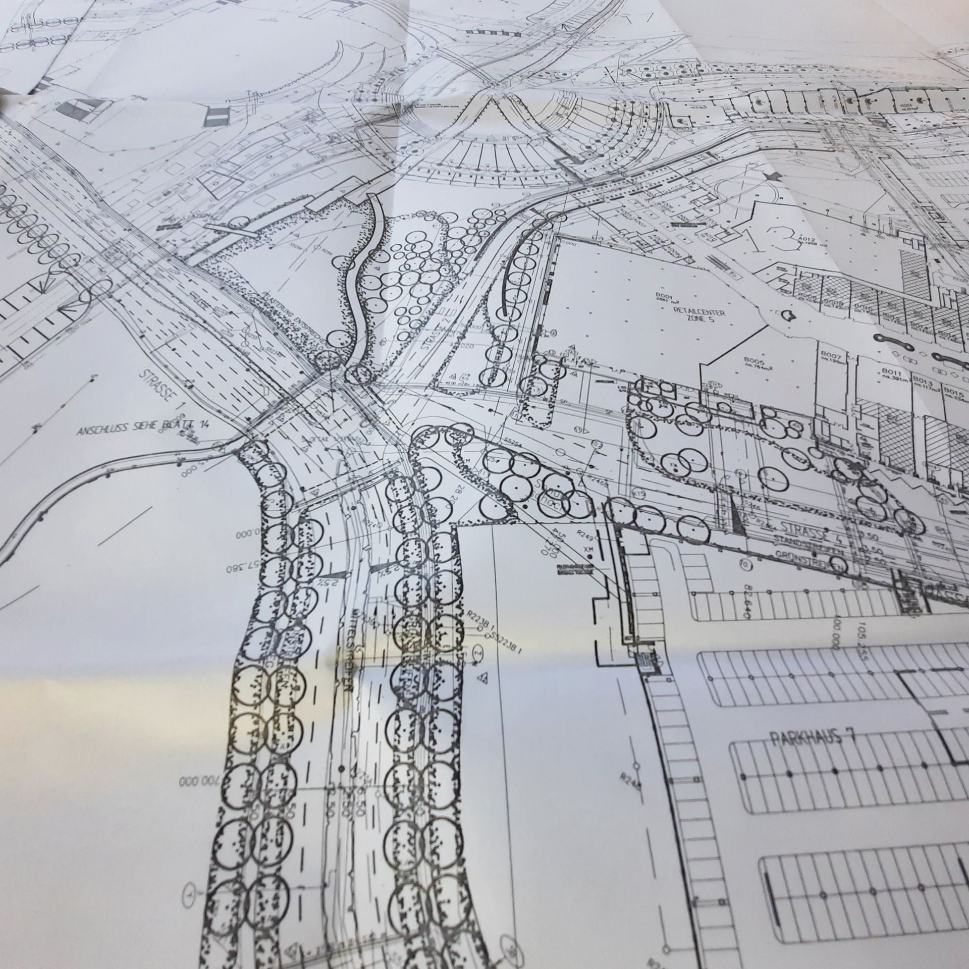 Abbildungen oben: Links das Präsentationsmodell des Gesamtprojektes (Foto: Stadium-Group). In der Mitte mein Baustellenplan als Basis für Ortsangaben bei Diktaten während eines Baustellenrundgangs: Nummeriert sind in Rot die 27 Treppenhäuser und in Beige die 13 Baukräne. Rechts ein Planausschnitt vom westlichen Eingangsbereich, dem Parkhaus 7 und der Planung für Straßen und Wege.