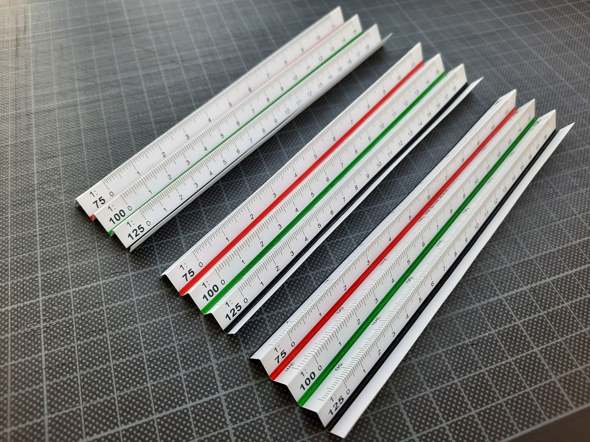 Die nur 15 cm langen Maßstäbe aus Kunststoff gab es mal zu kaufen und ich habe sie noch täglich im Einsatz. Einen solchen Dreikant kann man aber schlecht in die Tasche stecken. Ein flacher Maßstab lässt sich einfach besser verstauen. Die grafische Vorlage wird auf 160 g/m² Papier kopiert, gefaltet und geklebt. Die meisten Maßstäbe nutze ich selber, manche verschenke ich - mit aufgedruckter Internetadresse.