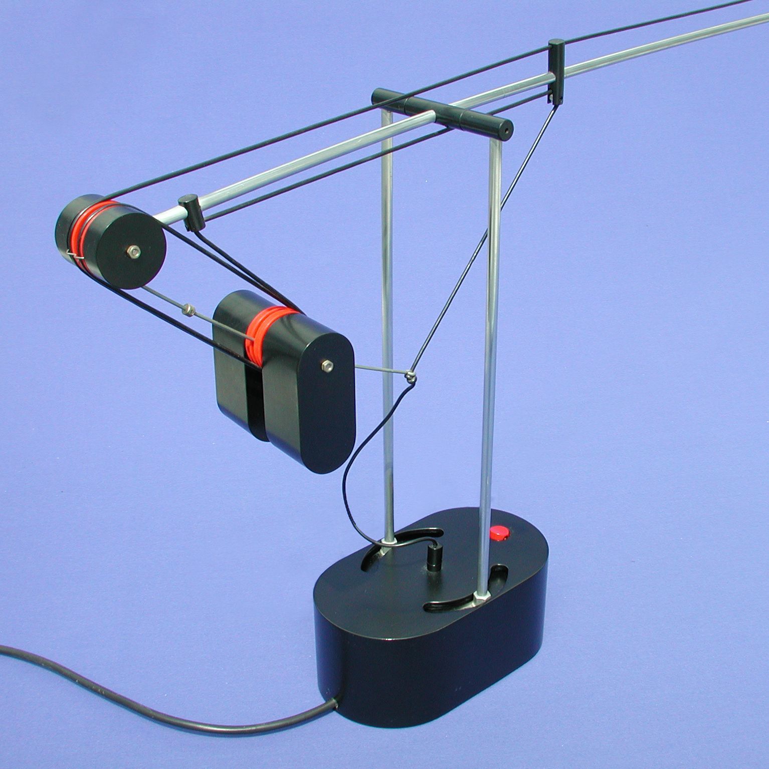Das rechte Drittel des glänzenden Rohres ist verschiebbar. Über einen Flaschenzug rollt beim Verschieben des halbrunden Leuchtenkopfes ein Gegengewicht eine schräge Ebene hinauf bzw. hinunter und so entsteht immer ein Gleichgewicht. Die Leuchte kann daher frei pendeln und ist dadurch trotz ihrer Filigranität sehr unempfindlich. Wenn man versehentlich dagegen kommt, weicht sie einfach aus. Bei einem internationalen Design-Wettbewerb kam die Leuchte in die Endauswahl.