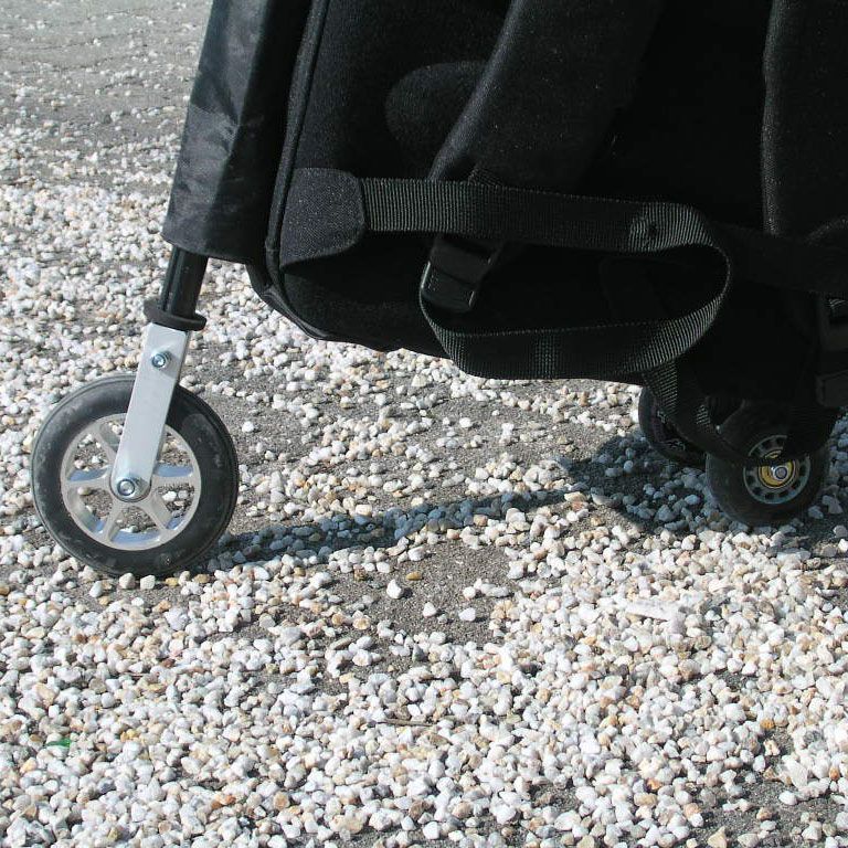 Nicht zum Hinterherziehen, sondern seitlich vom Körper sollte er zu führen sein, damit er einem nicht "in die Hacken fahren" kann, wenn man es eilig hat und große Schritte macht. Und er sollte straßentaugliche Rollen haben, da die Welt ja nicht nur aus glatten Flughafenfußböden besteht. Gefunden ist die Lösung mit leisen Rollen und einer Lenkstange. Eine überarbeitete Version wurde durch Zwillingsräder noch leiser und kann mehr Gewicht tragen, nämlich zwei Rucksäcke übereinander. Der obere Rucksack ist als Handgepäck abnehmbar und der untere rollbare Rucksack passt mit eingeschobener Teleskopstange in die Gepäckablage.