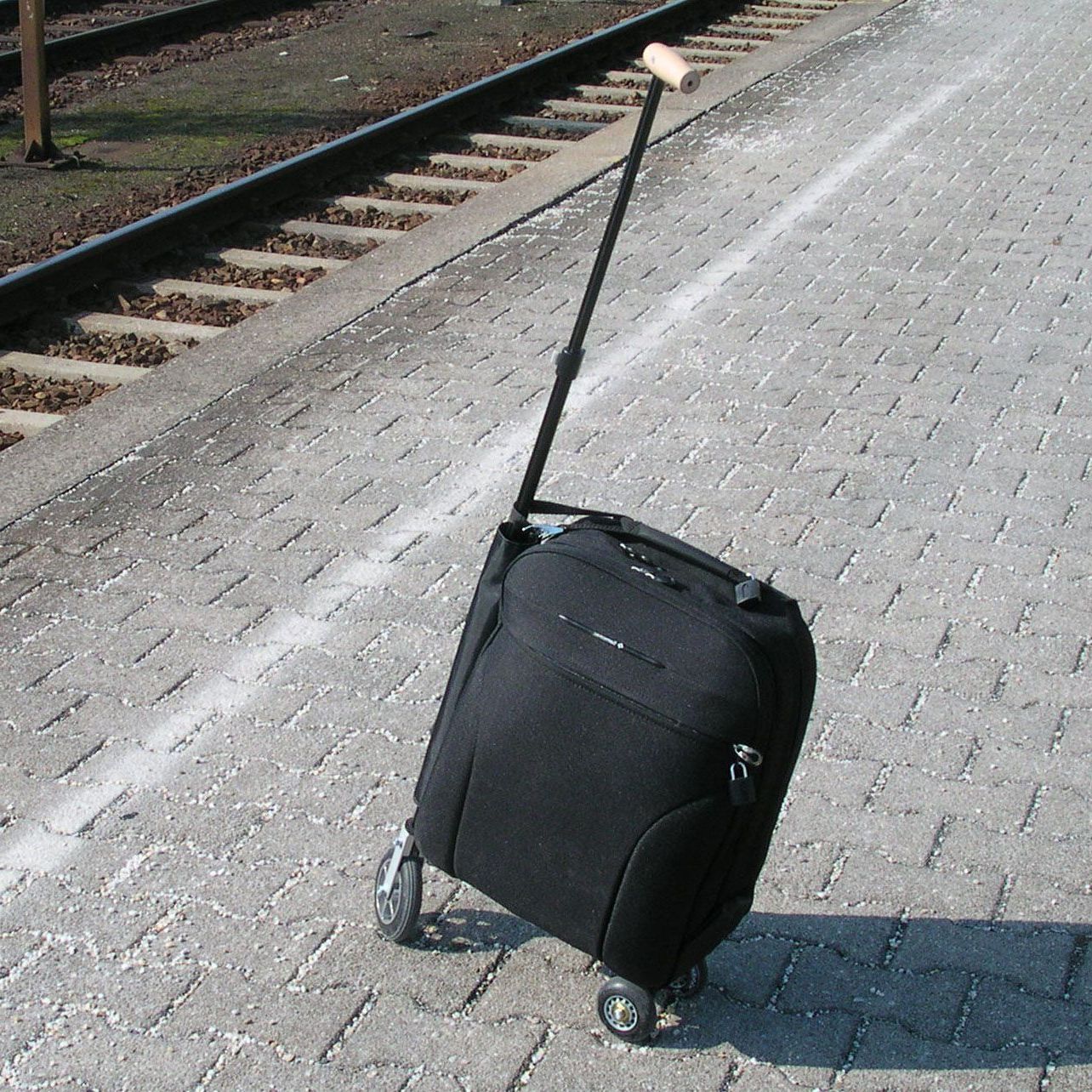 It shouldn't be pulled behind you, but rather to the side of your body, so that it doesn't "run into your heels" when you're in a hurry and taking long steps. And it should have wheels suitable for the road, as the world doesn't just consist of smooth airport floors. The solution was found with quiet castors and a handlebar. A revised version was made even quieter with twin wheels and can carry more weight, namely two rucksacks on top of each other. The upper rucksack can be removed as hand luggage and the lower rollable rucksack fits into the luggage rack with the telescopic handle inserted.