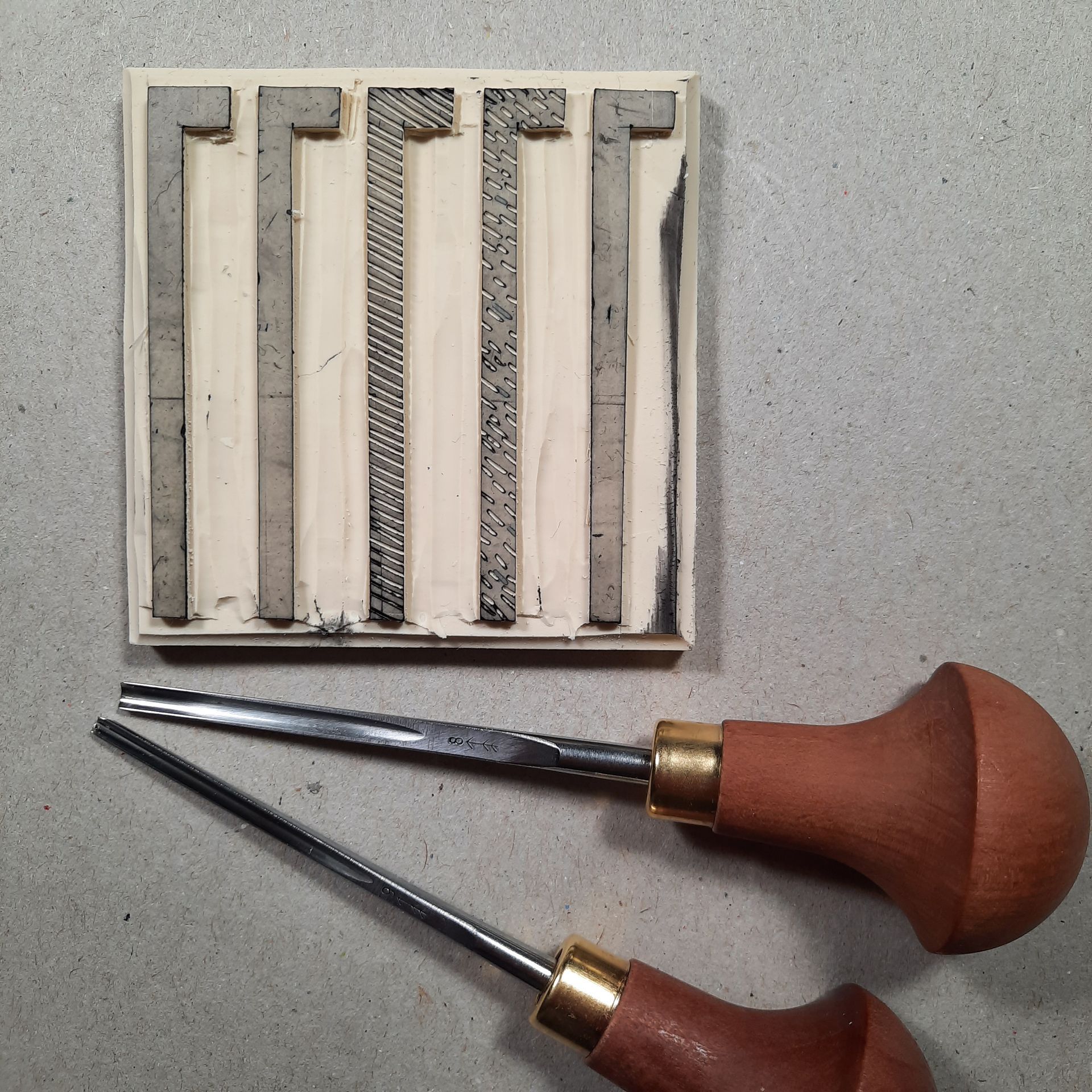 Die weiche Kunststoffplatte wurde mit Linolschnitt-Werkzeugen bearbeitet, mit einem einfachen Stempelkissen eingefärbt und dann von Hand mit leichtem Druck auf Papier gedruckt.