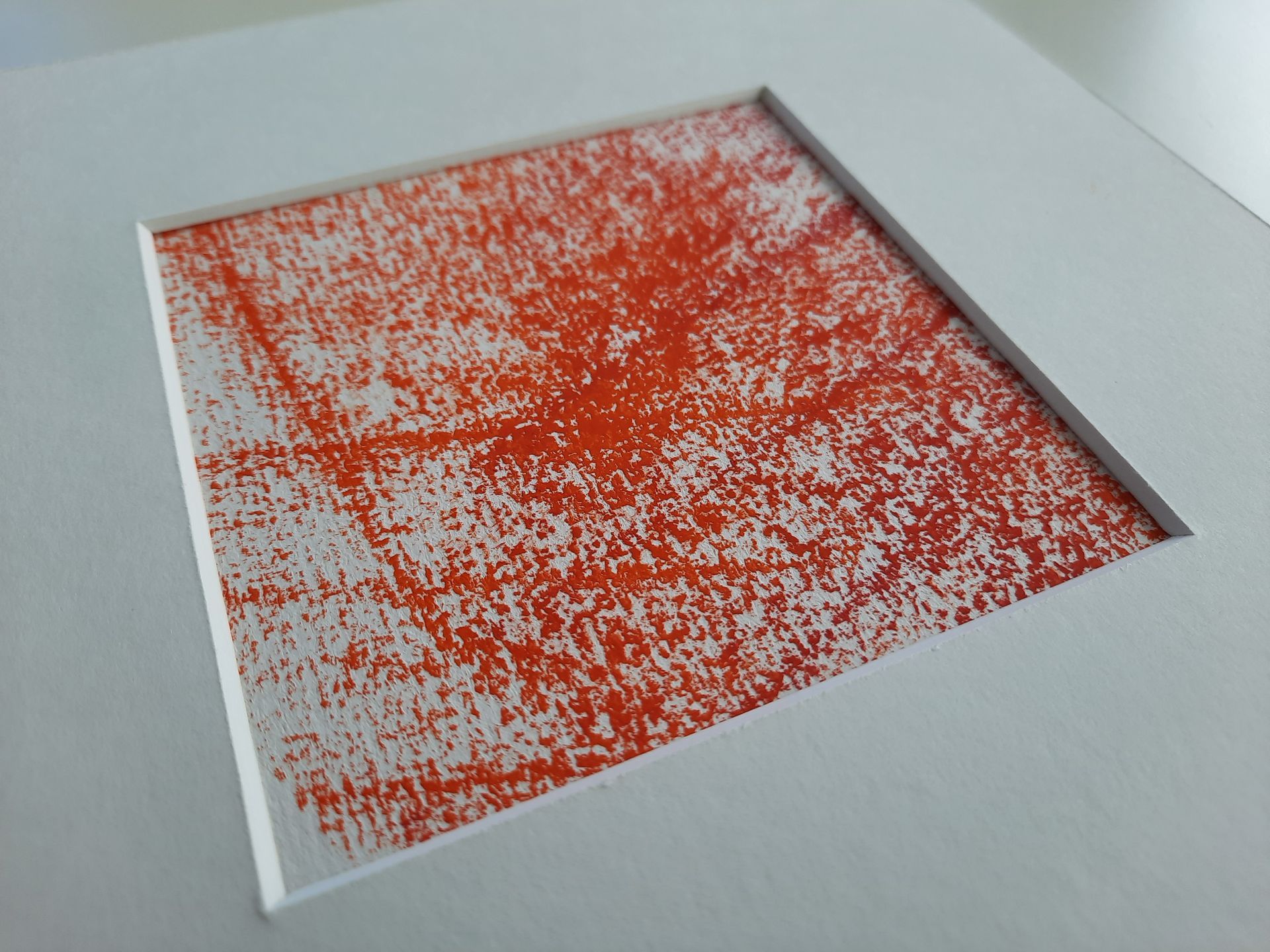 Auf dem strukturierten Papier bleibt Farbe nur auf den erhabenen Stellen haften - die Vertiefungen bleiben weiß und geben der Farbe eine besondere Leuchtkraft. Beim Kolorieren lag das Blatt in unterschiedlichen Positionen auf meiner Schneidematte und bildete die dort durch Schnitte mit dem Cutter entstandenen Erhebungen ab. So entstanden die streifenförmigen Farbstrukturen in Rot und Zinnoberrot.