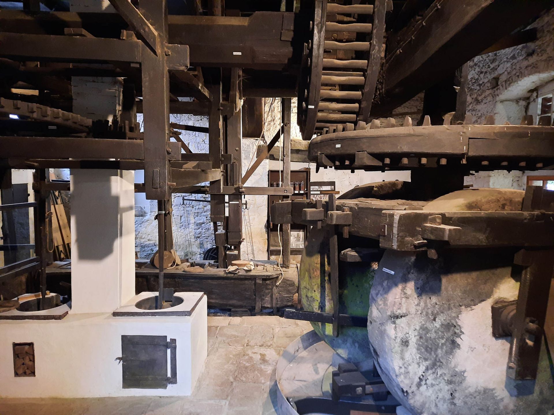 Oil mill in Brake: From the bridge southwest of the Finkenpforte path, you have a wonderful view of the mill and Brake Castle. On the east side of the mill, you can see the grinding mechanism inside through the barred openings of a door. To the right of the door is a button to switch on the interior lighting of the mill.